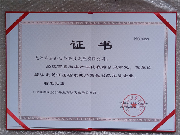 喜訊:九江市云山油茶科技發展有限公司今日從永修縣農業農村局領回江西省“省級農業產業化龍頭企業”牌匾、證書。這是本公司連續四次獲此榮譽。