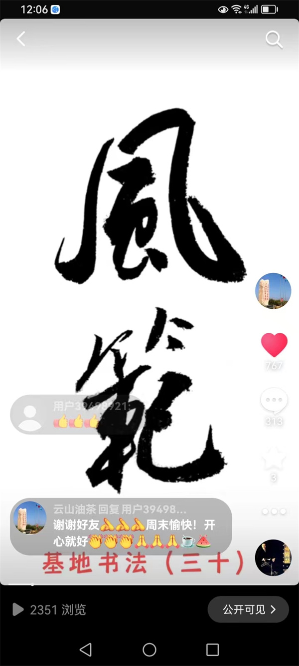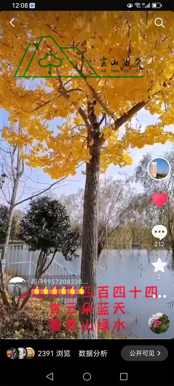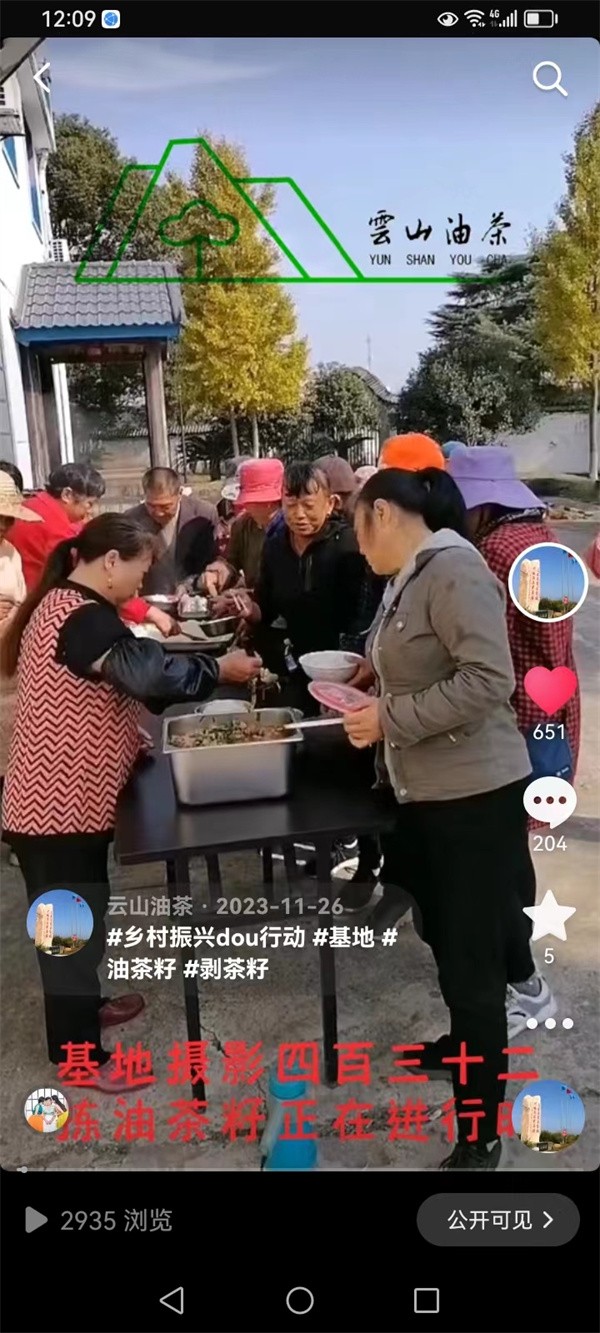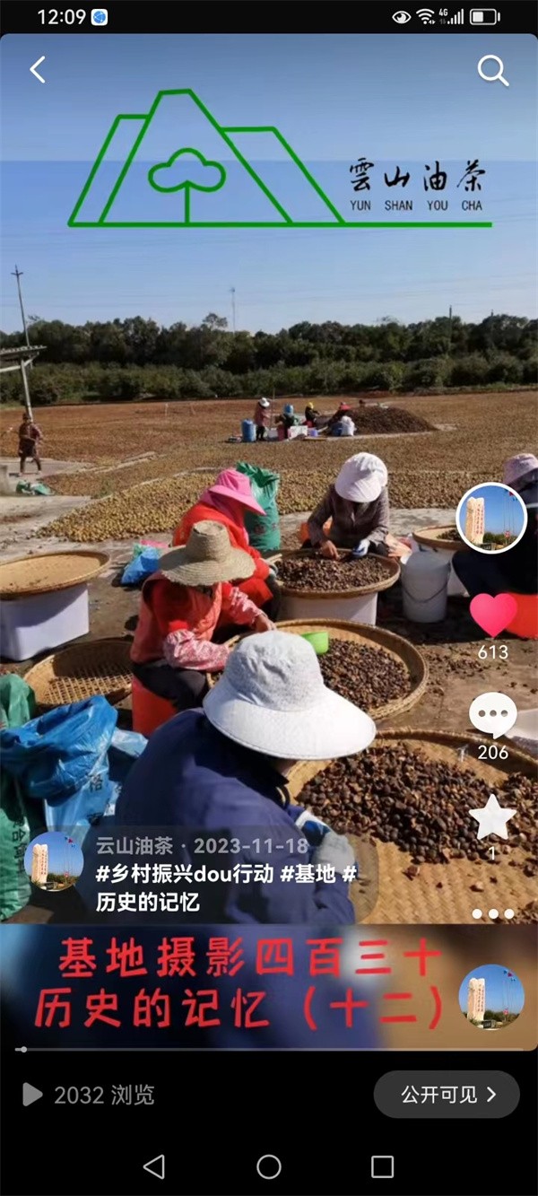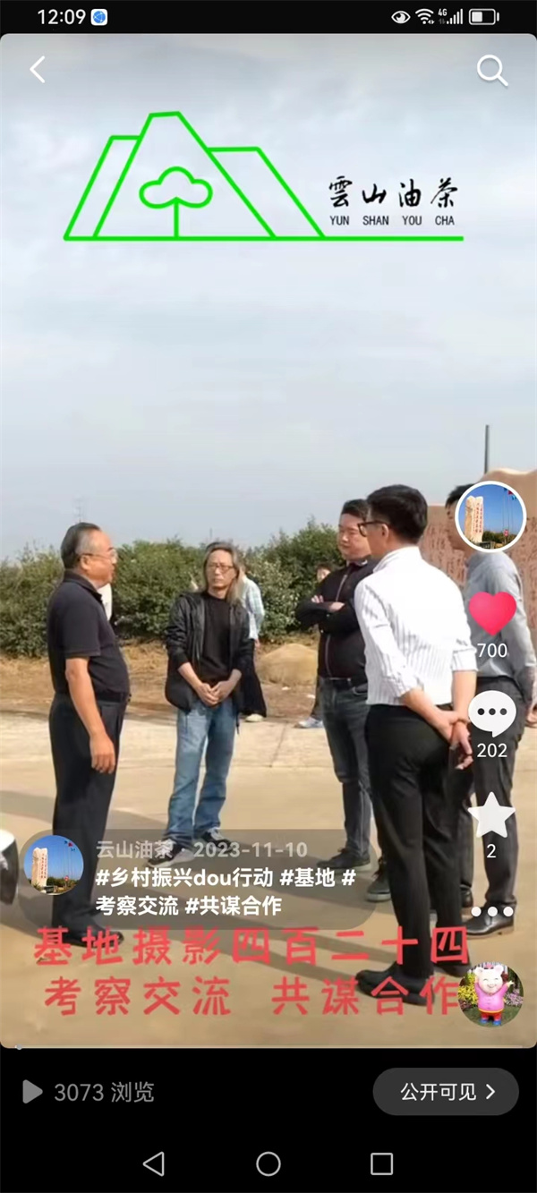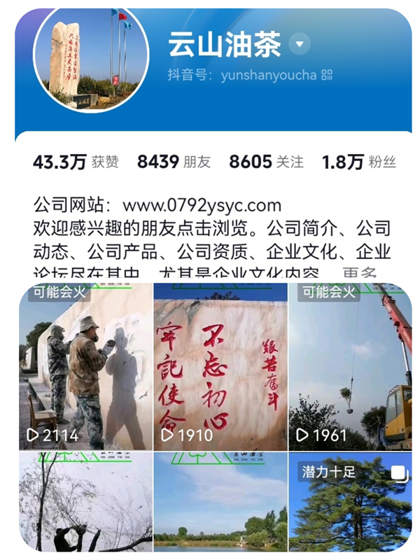 公司抖音號“云山油茶”自2021年10月23日上線以來,到今年元月1日為止,共發表作品715件,其中“基地攝影”457件,“員工假期攝影”183件,“基地書法”45件,其他30件。目前共有粉絲1.8萬人,獲贊量43.3萬人次,瀏覽量160多萬人次。兩年多來,公司堅持傳播正能量,堅持素材的原創性和真實性,堅持內容、畫面與配樂的統一性和作品整體效果的藝術性與觀賞性,不片面追求粉絲量、獲贊量和瀏覽量,把評判權交給粉絲和廣大受眾,并以平和、謙遜的姿態去對待每一個贊揚和建議,在他們的評判中不斷改進和提高,從他們的評判中不斷汲取營養和力量。使抖音號“云山油茶”成為云山油茶公司企業文化建設的又一看點和亮點。